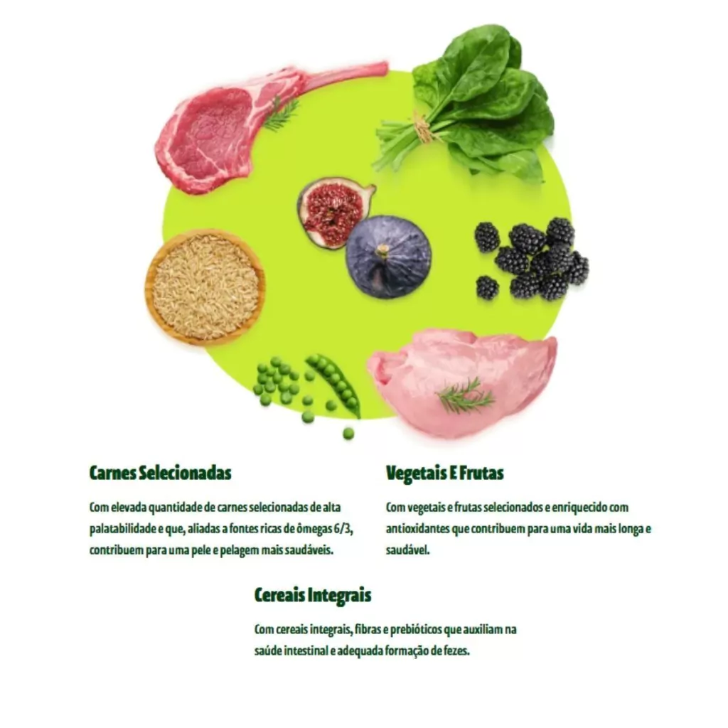 Saúde da pele e pelagem: Enriquecida com ômegas 6 e 3, promove brilho e maciez na pelagem.